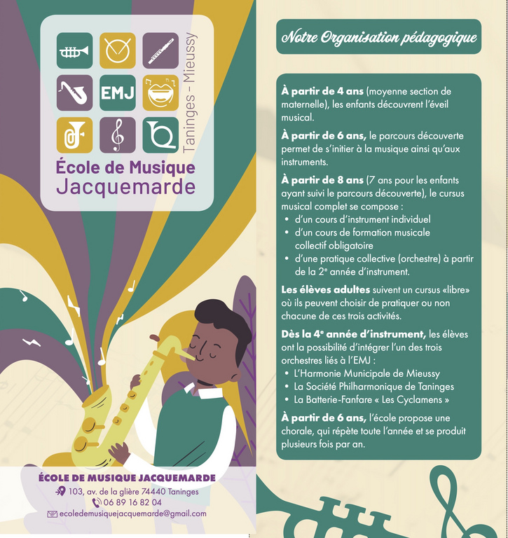 Dynamique et pleine de projets, l'EMJ est fière de ses activités et de ses élèves. Forte de 8 professeurs professionnels, et de 70 à 80 élèves, elle propose des cours d'instruments à vent (Saxophone, Clarinette, Trombone, Cor, Euphonium, Flûte traversière, Cornet, Trompette) et à percussions, ainsi que des cours de chant chorale pour enfants.